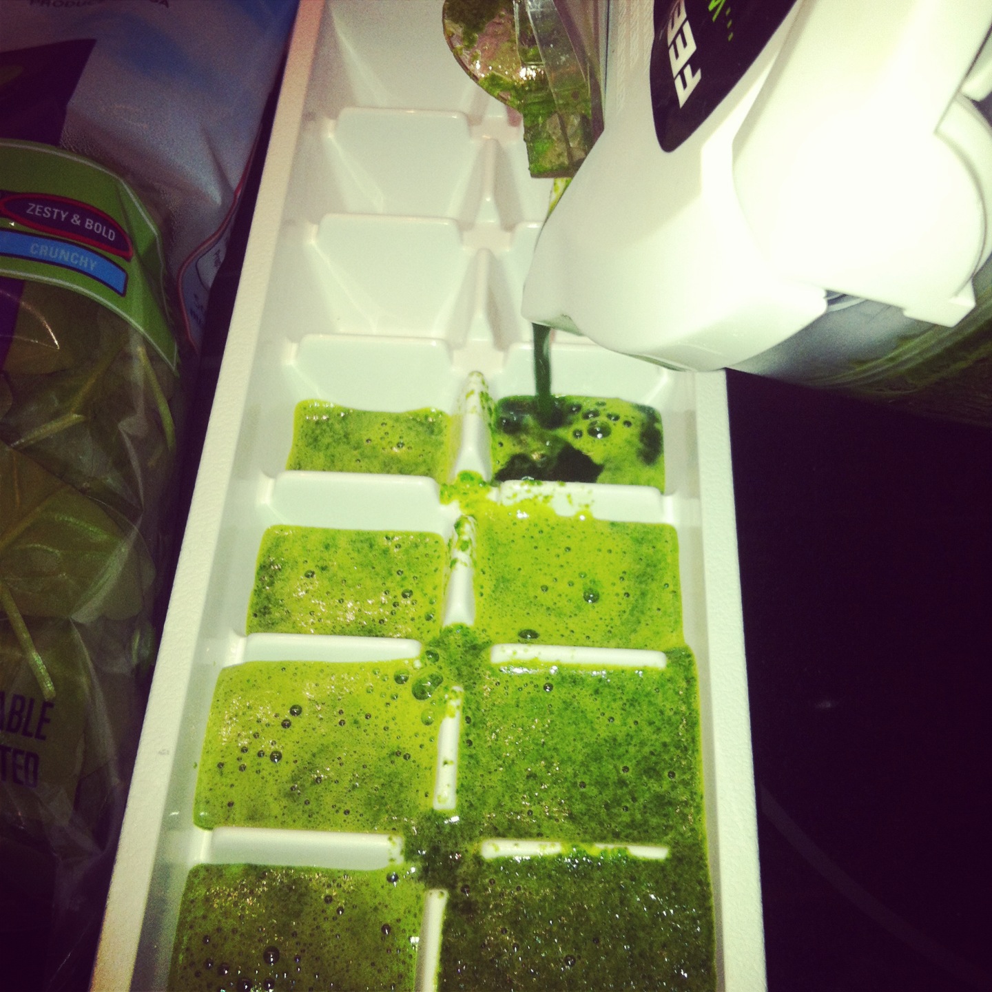 Sure, you can just blend in some spinach each time you make your smoothies. Or you can do a big batch at once and freeze it into cubes. Genius!! I love this because I always found myself wasting some of the bag, and it takes up a lot of room in the fridge. This also comes in handy if you are not using any frozen fruit. Blend up a bag of spinach with a little water to get it started, pour into trays, freeze, and you are set!