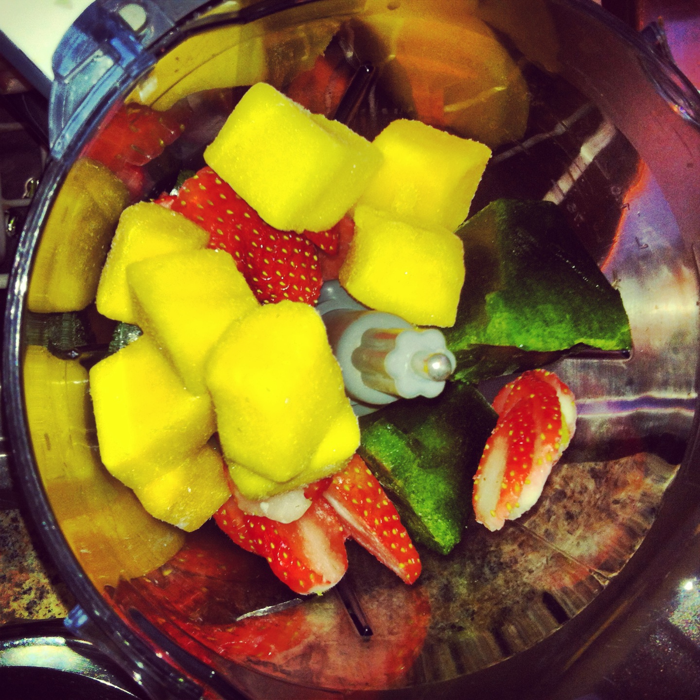 - Frozen [or fresh] fruit of choice: my favorites are strawberries and mango and banana. [ The only time that I like banana]