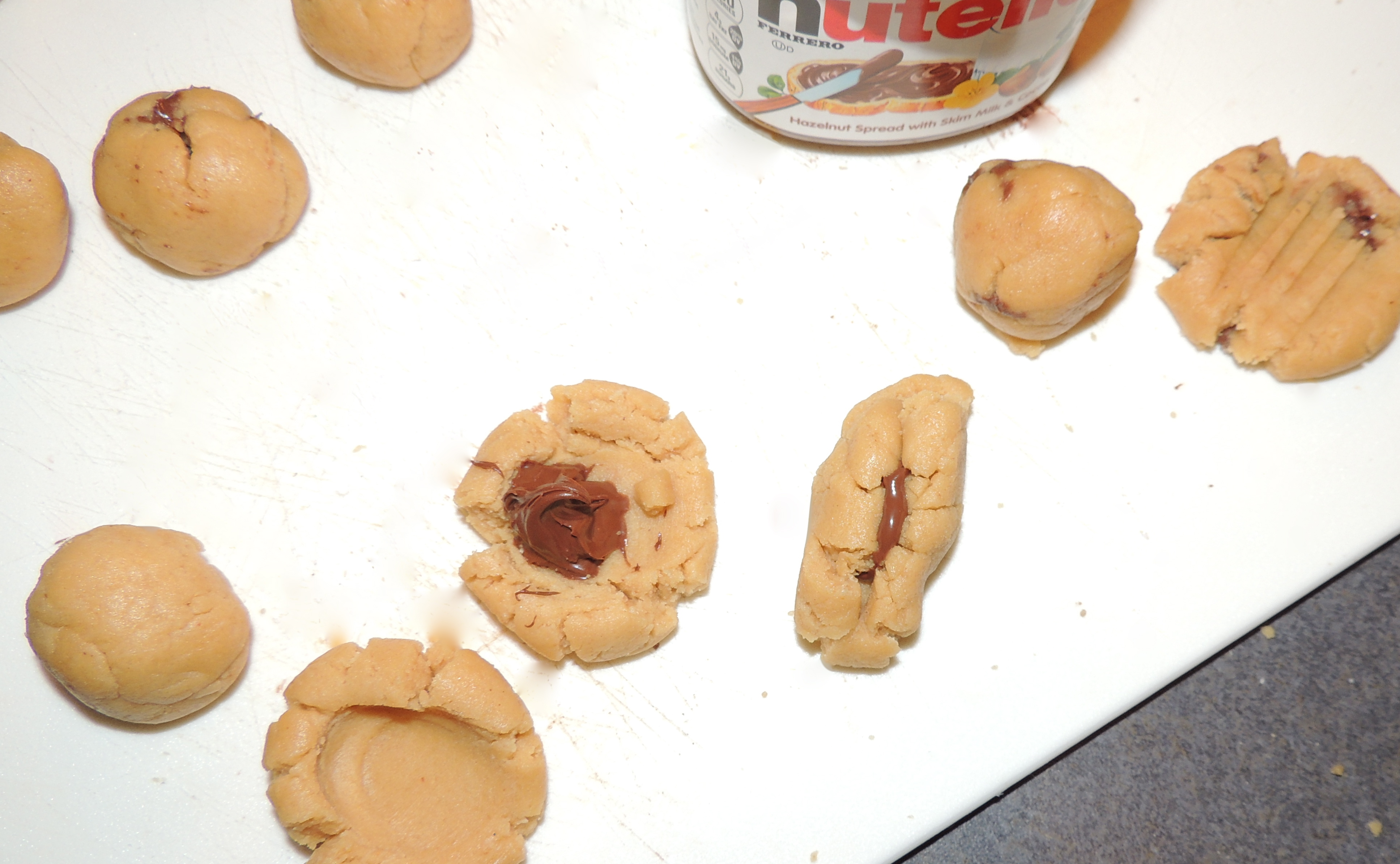 Next we will do a little progression [shown above]. Roll the dough into small balls. Make a thumb print in each. Put a small blob of Nutella in each indentation. Pull up sides and pinch together. Roll the ball again in your hands. [ will be a little messy- don’t worry!] Place on parchment lined cookie sheet and press them down slightly with a fork.