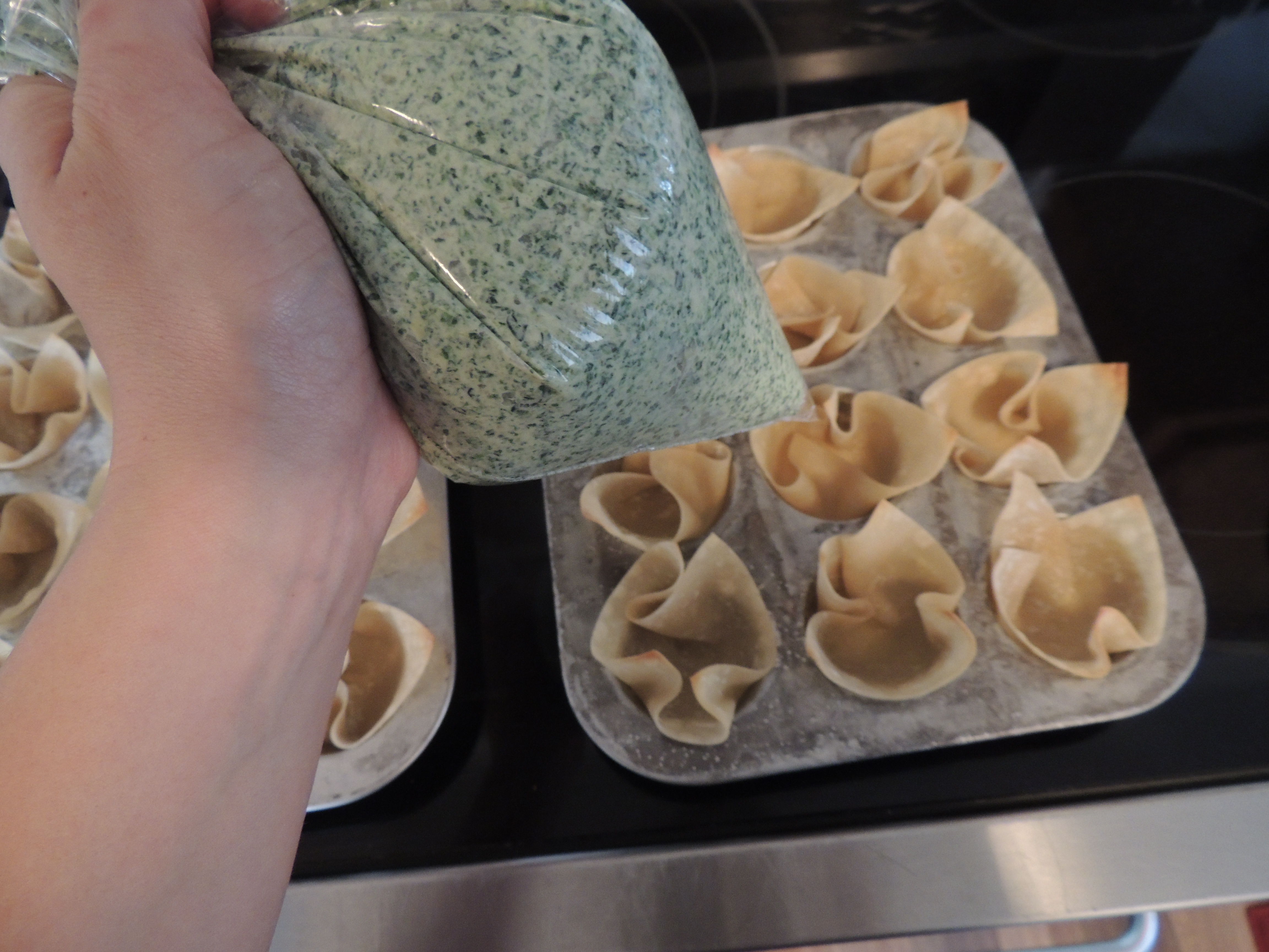 Now, pour your dip into a zip lock bag and seal it up. Cut off one of the bottom tips and pipe the dip into each of the cups. Fill as much/ as little as you would like. I sprinkled a little extra cheese on each one as well. I had some extra dip left in the bag– you can either use to make more wonton cups or bake it by itself in a small ramekin.