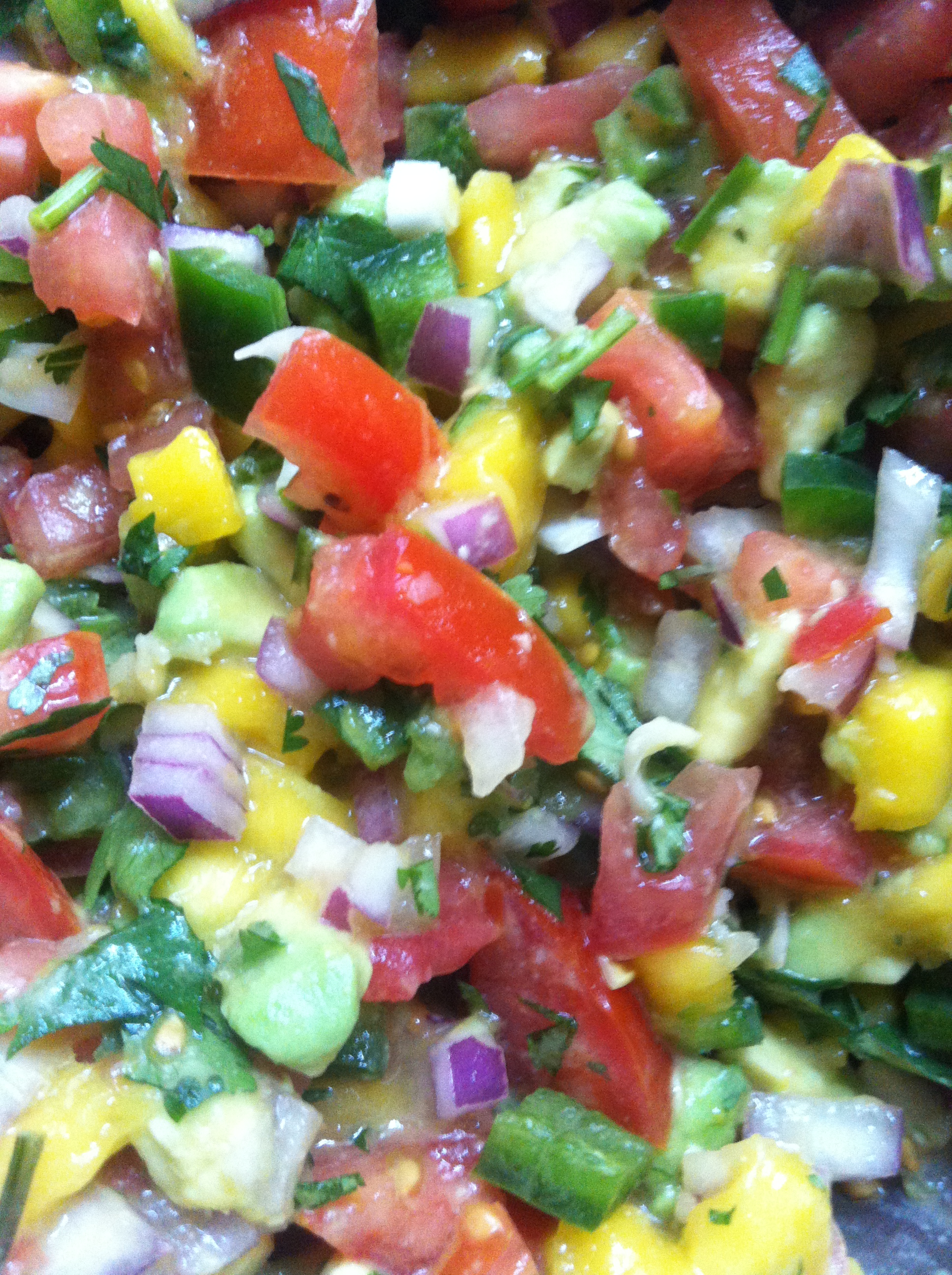 Combine all ingredients into a big bowl and mix lightly. If you aren’t a fan of chunky salsa- you could definitely put everything into a blender or food processor. But when I am using fresh, beautiful ingredients such as these, I prefer to show them off.